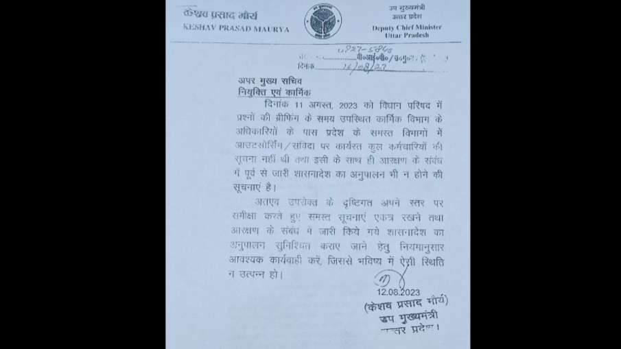 यह पत्र बताया जा रहा है कि पुराना है, लेकिन इसने विपक्ष को एक बार फिर मुद्दा दे दिया है। विपक्ष आने वाले मॉनसून सत्र में सरकार को इस मुद्दे पर घेरने की तैयारी कर रहा है। जानकारी के अनुसार, 12 अगस्त 2023 को डिप्टी सीएम केशव मौर्या ने नियुक्ति एवं कार्मिक विभाग को एक पत्र लिखा था जिसमें उन्होंने संविदा और आउटसोर्सिंग की भर्तियों में आरक्षण को लेकर सवाल उठाए थे।