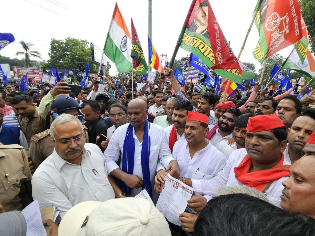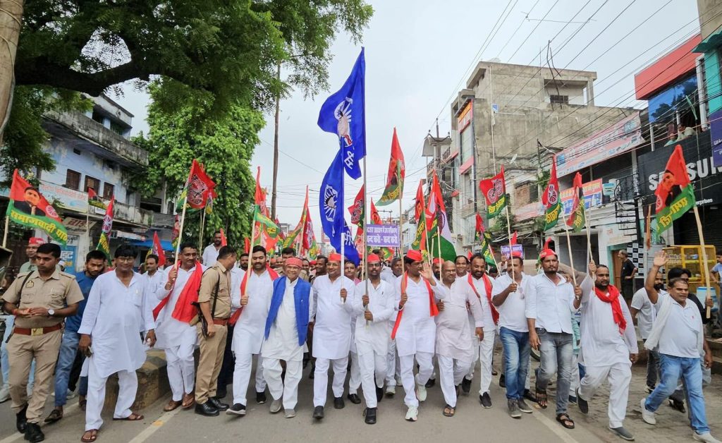 कटेश्वर पार्क से सपा, भीम आर्मी और अन्य संगठनों के नेता और कार्यकर्ता कलेक्ट्रेट की ओर बढ़े। उनके हाथों में अपनी-अपनी पार्टियों के झंडे थे, और वे जोरदार नारे लगाते हुए चल रहे थे। कलेक्ट्रेट पहुंचने के बाद, उन्होंने जिलाधिकारी को एक ज्ञापन सौंपा, जिसमें भारतीय जनता पार्टी (भाजपा) पर आरक्षण समाप्त करने की साजिश का आरोप लगाया गया था।