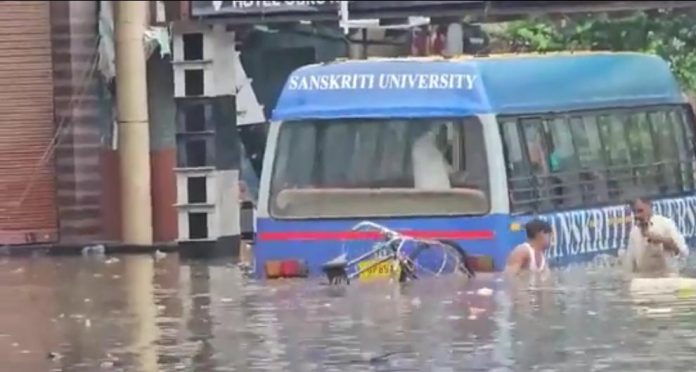 मथुरा: श्री कृष्ण जन्माष्टमी से पहले मथुरा में हुई भारी बारिश ने नगर निगम और प्रशासन के तमाम दावों को धराशायी कर दिया है। शुक्रवार को हुई मूसलाधार बारिश ने पूरे शहर को जलमग्न कर दिया, जिससे जनजीवन बुरी तरह प्रभावित हुआ। बारिश के कारण कई सड़कों पर पानी भर गया और सड़कों की स्थिति बदतर हो गई। कुछ स्थानों पर सड़कों के क्षतिग्रस्त होने की भी खबरें आई हैं, जिससे वाहन चालकों को भारी परेशानी का सामना करना पड़ रहा है। कई लोगों को अपनी गाड़ियाँ खींचकर ले जाने पर मजबूर होना पड़ा।