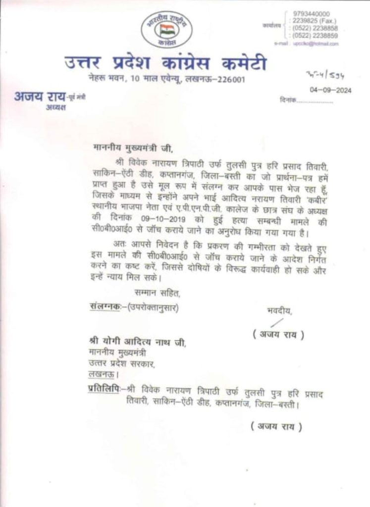 अजय राय ने अपने पत्र में मुख्यमंत्री योगी आदित्यनाथ से आग्रह किया है कि विवेक नारायण त्रिपाठी उर्फ़ तुलसी, जो कि बस्ती जिले के कप्तानगंज क्षेत्र के ऐंठी डीह गांव के निवासी हैं, द्वारा भेजे गए प्रार्थना पत्र को संज्ञान में लिया जाए। विवेक नारायण त्रिपाठी ने अपने प्रार्थना पत्र में अपने भाई आदित्य नारायण तिवारी उर्फ़ कबीर, जो स्थानीय भाजपा नेता और ए.पी.एन. पी.जी. कॉलेज के छात्र संघ अध्यक्ष थे, की हत्या के मामले में सीबीआई जांच की मांग की है।