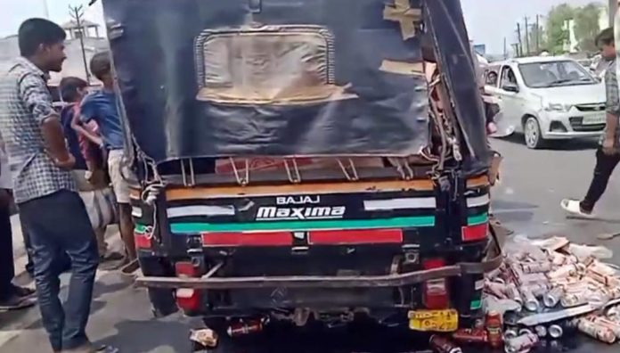 तेज रफ्तार में दौड़ रही ऑटो का संतुलन बिगड़ते ही वह सड़क किनारे पलट गई, जिससे दर्जनों बीयर की बोतलें बिखर गईं