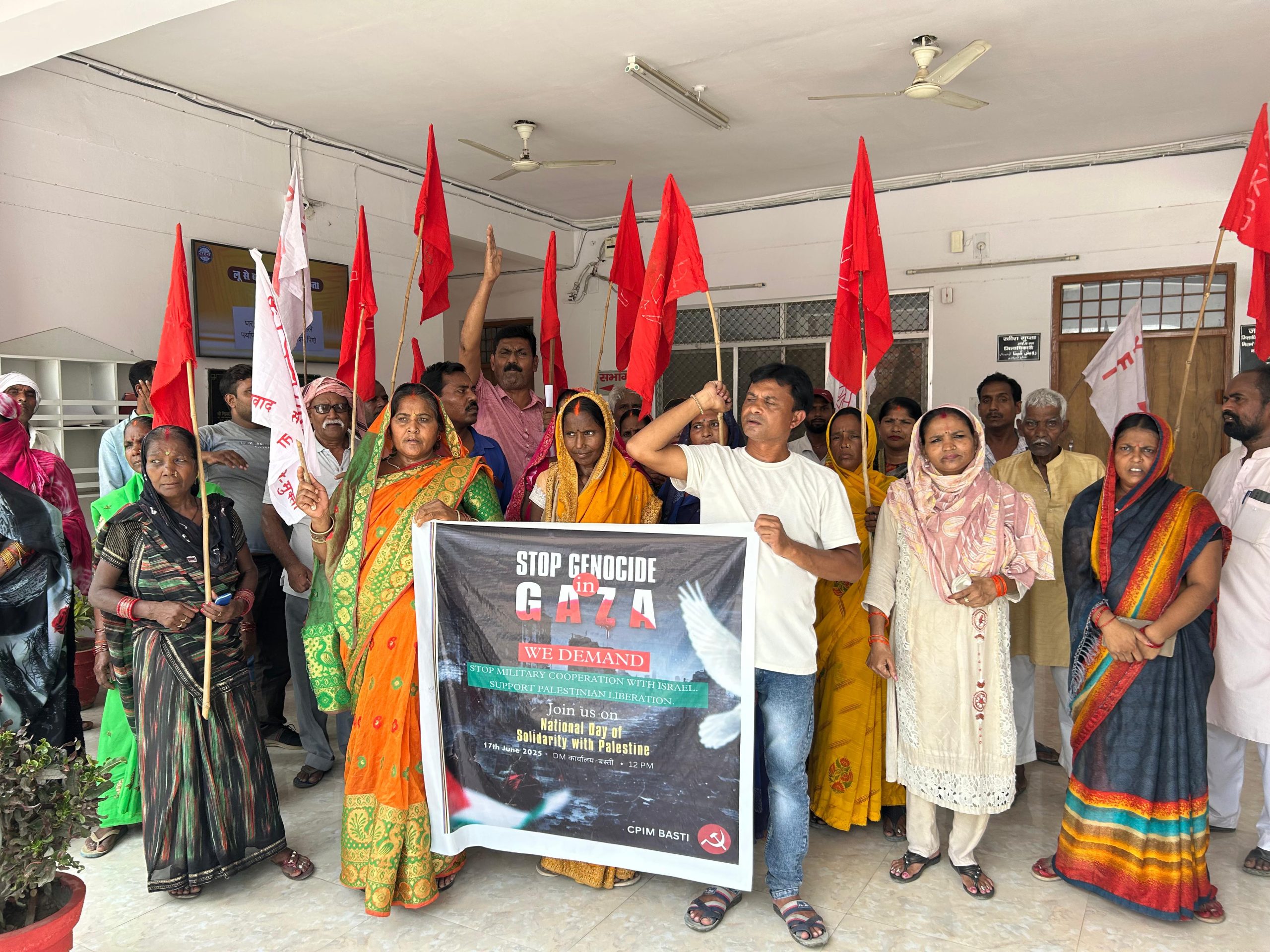 फिलिस्तीन के साथ एकजुटता दिवस के क्रम में माकपा नेता कामरेड के के तिवारी ,भाकपा नेता अशर्फी लाल गुप्ता के नेतृत्व में पदाधिकारी,कार्यकर्ताओं ने लोहिया मार्केट स्थित सीटू कार्यालय से फिलिस्तीन के समर्थन में बैनर के साथ जबरदस्त नारेबाजी करते हुए कचहरी परिसर से होते हुए जिलाधिकारी कार्यालय पर प्रदर्शन किया और जिलाधिकारी बस्ती के माध्यम से मांगपत्र राष्ट्रपति को भेजा। मांग पत्र में केंद्र सरकार को इजरायल की निंदा करने ,गाजा,फिलिस्तीन में नरसंहार के लिए इजरायल अमेरिका गठजोड़ को जिम्मेदार ठहराने ,परंपरागत विदेश नीति के तहत फिलिस्तीन के साथ खड़े होने का निर्देश देने की मांग किया। इसके साथ ही गाजा में राहत सामग्री भेजे जाने ,ईरान पर एक तरफा हमले के जिम्मेदार इजरायल से सैन्य और सुरक्षा के समझौते को रद्द करने ,संयुक्त राष्ट्र संघ में इजरायल को जिम्मेदार ठहराए जाने के लिए प्रयास किए जाने की मांग किया गया