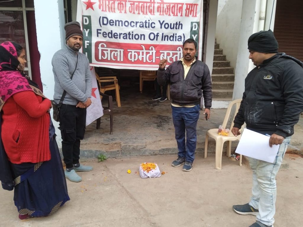 बस्ती।19 दिसंबर। भारत की जनवादी नौजवान सभा ने कैंप कार्यालय पर काकोरी कांड के शहीदों के बेदी पर पुष्पांजलि अर्पित करते हुए राम प्रसाद बिस्मिल,अशफाक उल्लाह, रोशन सिंह और राजेंद्र लाहिड़ी समेत अन्य क्रांतिकारियों को याद किया।