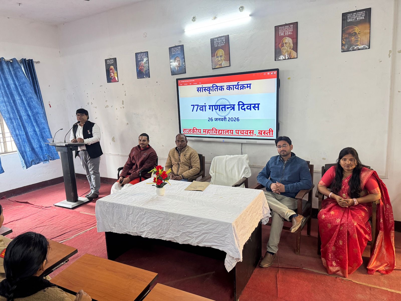 बस्ती। इन्द्रासन सिंह स्वतंत्रता संग्राम सेनानी राजकीय महाविद्यालय, पचवस-बस्ती में गणतंत्र दिवस के अवसर पर विविध कार्यक्रम उत्साहपूर्वक आयोजित किए गए। कार्यक्रम की शुरुआत प्राचार्य डॉ. विशाल श्रीवास्तव द्वारा ध्वजारोहण से हुई। एनसीसी कैडेट्स ने गार्ड ऑफ ऑनर प्रस्तुत किया और समवेत राष्ट्रगान के साथ महापुरुषों व स्वतंत्रता सेनानियों को स्मरण किया गया।