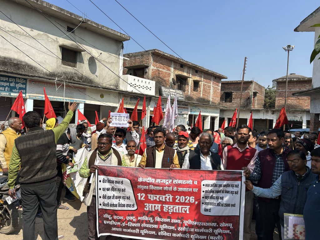 बस्ती, 12 फरवरी। ट्रेड यूनियन संगठनों और संयुक्त किसान मोर्चा ने जनपद में आयोजित देशव्यापी आम हड़ताल को सफल बताया है। सीटू सहित विभिन्न केंद्रीय श्रमिक महासंघों, खेत मजदूर यूनियन और संयुक्त किसान मोर्चा के आह्वान पर श्रमिकों और किसानों की मांगों को लेकर व्यापक प्रदर्शन किया गया।