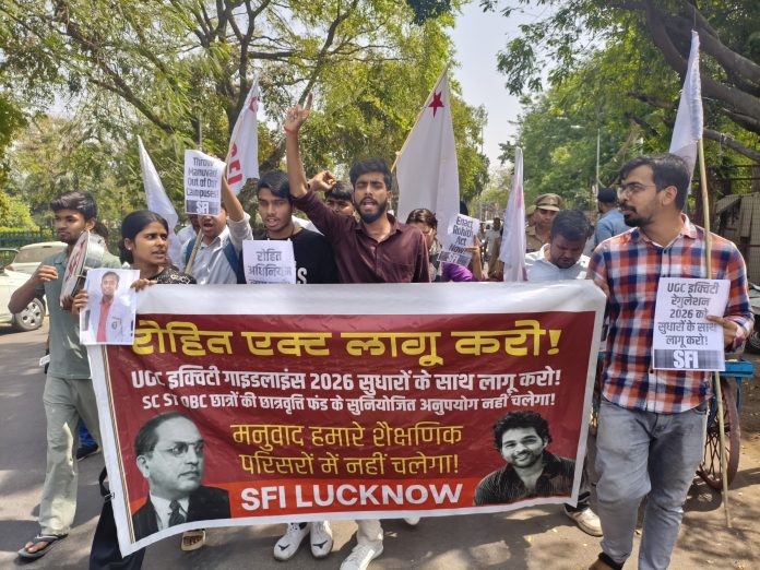 लखनऊ। स्टूडेंट्स फेडरेशन ऑफ इंडिया (SFI) के बैनर तले मंगलवार को राजधानी में छात्रों ने परिवर्तन चौक से जिलाधिकारी कार्यालय तक पैदल मार्च निकालकर ‘रोहित एक्ट’ और यूजीसी इक्विटी रेगुलेशन 2026 लागू करने की मांग उठाई। प्रदर्शनकारियों ने विभिन्न मांगों को लेकर जिलाधिकारी के माध्यम से राष्ट्रपति को संबोधित ज्ञापन भी सौंपा।